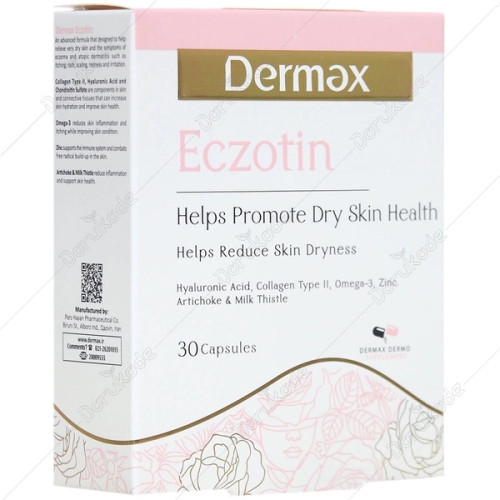 ECZOTIN ( DERMAX ) - CAPSULE . اگزوتین درمکس، کمک به کاهش خشکی پوست حفظ سلامت پوست با دارا بودن عصارههای گیاهی، امگا 3، کلاژن هیدرولیز شده، هیالورونیک اسید، گاما لینولئیک اسید حاوی عناصر معدنی زینک و سلنیوم جهت مراقبت پوست، مو و ناخن دارای خواص آنتیاکسیدانی به واسطه داشتن سلنیوم و عصاره هسته انگور توصیه مصرف روزانه 2 عدد کپسول اگزوتین، یکی صبح و دیگری عصر قرص اگزوتین، فاقد گلوتن، سویا، گندم، شیر، تخم مرغ، هرگونه شیرینکننده و نگهدارنده