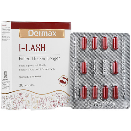 . I-LASH ( DERMAX ) - CAPSULE. آی لش درمکس، مکمل تغذیهای برای کمک به حفظ سلامت مو و تقویت مژه و ابرو آی لش درمکس، حاوی مولتیویتامین به ویژه بیوتین و ویتامین B5 در کنار مواد معدنی همچون زینک به فرم زینک سولفات منوهیدرات همراه با اینوزیتول مکمل آی لش، کمککننده به جلوگیری از ریزش مو ناشی از کمبود مواد مغذی دارای اثرات کمکی در بهبود رشد موها کمککننده به تقویت ضخامت مو با داشتن دوز مناسبی از پانتوتنیک اسید (ویتامین B5) بدون سویا، شیر، گندم، تخم مرغ، هرگونه شیرینکننده و نگهدارنده